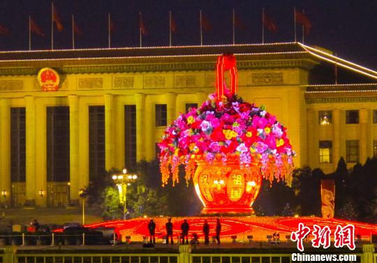 11月9日的北京天安门广场,正在召开的十八大主会场外,巨大的花篮式彩灯在傍晚点亮。中新社发 贾国荣 摄