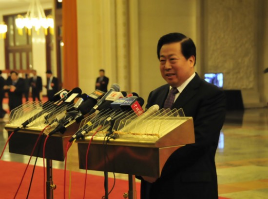 3月17日上午9时,第十二届全国人民代表大会第一次会议在人民大会堂举行闭幕会。图为环保部部长周生贤会前接受记者集体采访。新华网苏影 摄