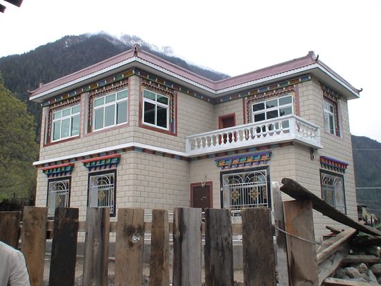 波密县扎木镇农牧民修建的安居新房,摄于2009年4月1日。