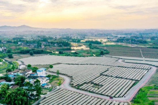 4月26日傍晚,夕阳映照下的广安华蓥现代农业大棚基地与邻近泛着金光的农田相映成趣,构成一幅美丽的乡村画卷。