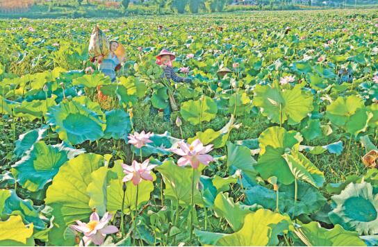 日前,广安日报前锋区广兴镇桥角村村民在采摘莲子。 桥角村立足地域生态优势,以村民投资投地入股和向上争取等方式筹集资金,大力发展莲子产业,促进农业增效、农民增收。今年全村种植的300余亩莲子预计产量1.3万公斤,产值近100万元。(前锋记者站 刘华 广安日报记者 曾诚 张启富 摄)