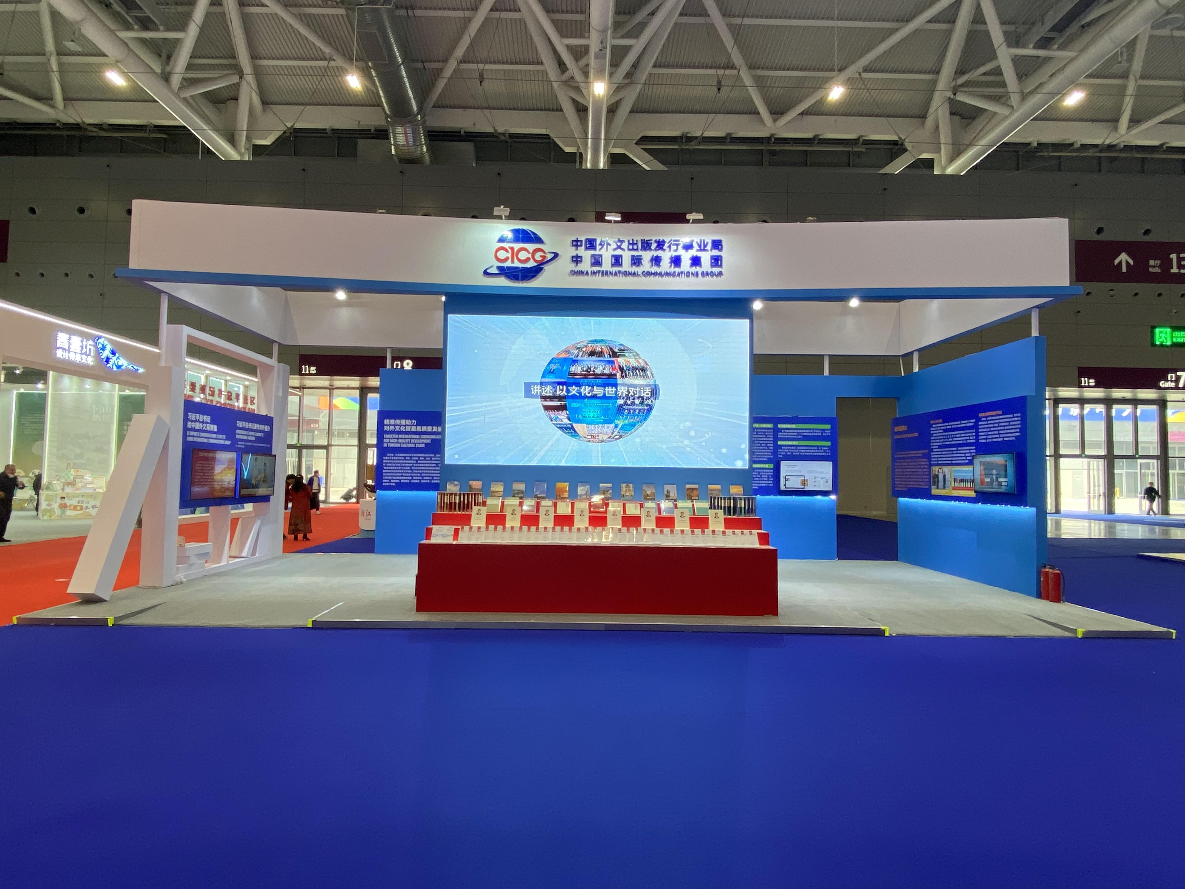 中国外文局展台重点围绕“全面对外宣介习近平新时代中国特色社会主义思想”“精准传播助力对外文化贸易高质量发展”两大主题进行策展,全面展现外文局的事业发展格局、产业发展活力和融合创新前景,充分展示了外文局近年来以推进对外文化贸易高质量发展为使命责任,加快推动产业振兴工程,实施“精准传播联合行动”,加强翻译“国家队”和一流智库建设,精心打造“1+3”国际传播品牌体系,持续拓展文化传播新路径的重要成果。
