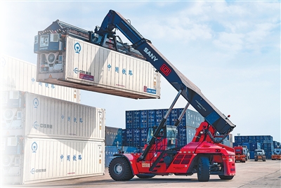 在中老铁路万象南货运口岸站,起重机吊起即将发往中国的冷链集装箱。 |