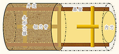 芯撑则是指在铸型中用于保持内芯与外范相对位置的支撑物,其功用是避免内芯和外范之间的错位和粘连,以保证器壁浇铸的完整性。三星堆青铜器中发现了与芯撑具有同样作用的构件,它形状上呈条状,横向贯穿包括器表、器壁和泥质内芯,材质均为铜制,称为“条形芯撑”。