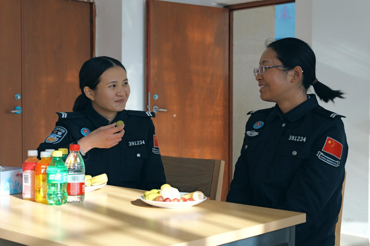 执勤间隙,民警于蜜珍(左)与班馨月(右)围坐分享日常,在轻松的氛围中缓解高海拔工作的压力。人民网 石曲次旺摄